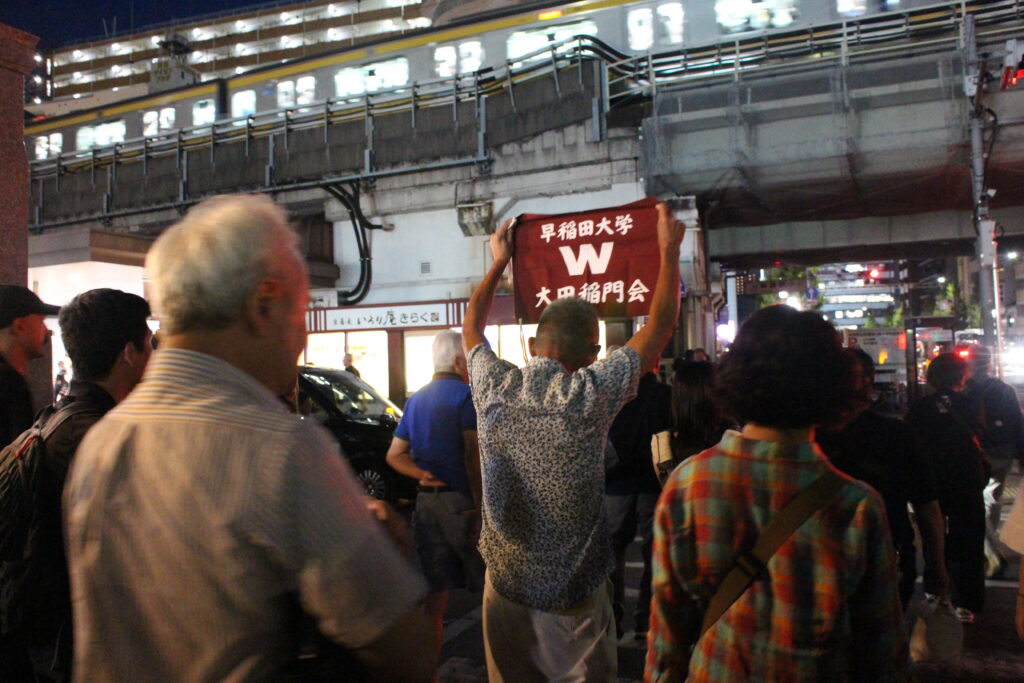取り組みもさりながら国技館の場の面白さを堪能して、いざ「ちゃんこ懇親会」へ。しかし終了後の出口周辺の混雑ぶりは満員電車なみ。早稲田大学の旗を掲げて下さる心遣いに頭が下がります。