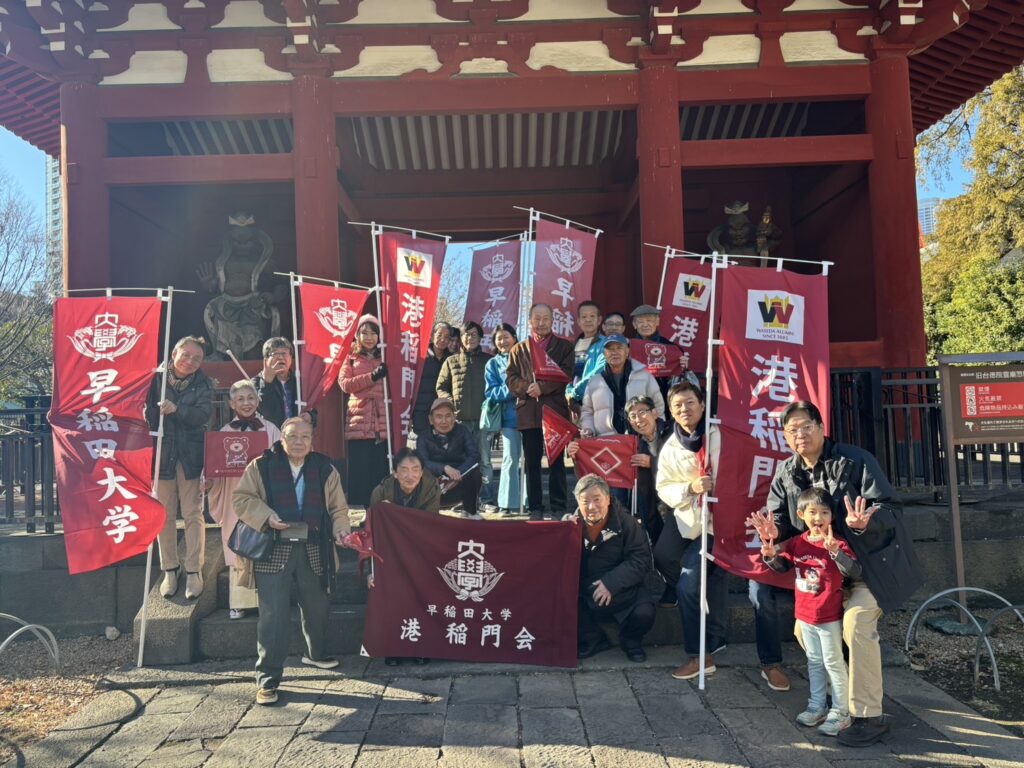 新春1月3日、新年の恒例行事である箱根駅伝応援会・新年会を開催しました。母校を応援しようと20名を超える港稲門会の会員や、早稲田大学の幟旗に誘われた校友たちが増上寺隣の芝公園前に集まりました。