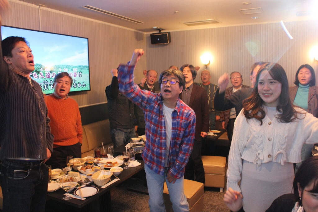 今回もカラオケルームの宴会個室であったので、「早稲田大学校歌」をカラオケバージョンで斉唱しました。