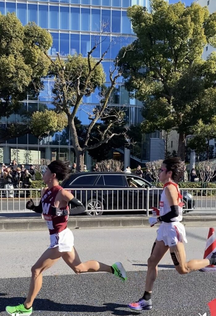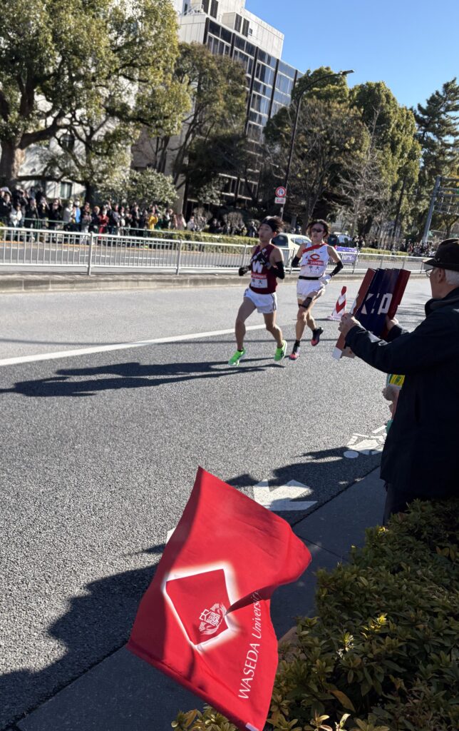 翌日3日の復路では、お昼12時30分頃になると、応援場所である増上寺、芝公園付近の沿道は多くの応援者で賑わいました。昨年は、國學院大學と3位争いの並走をしながら我々の前を通過していきましたが、今年も、中央大学と3位争いの並走をしながらの通過でした!早稲田10区を走る瀬間選手を必死に応援しました!